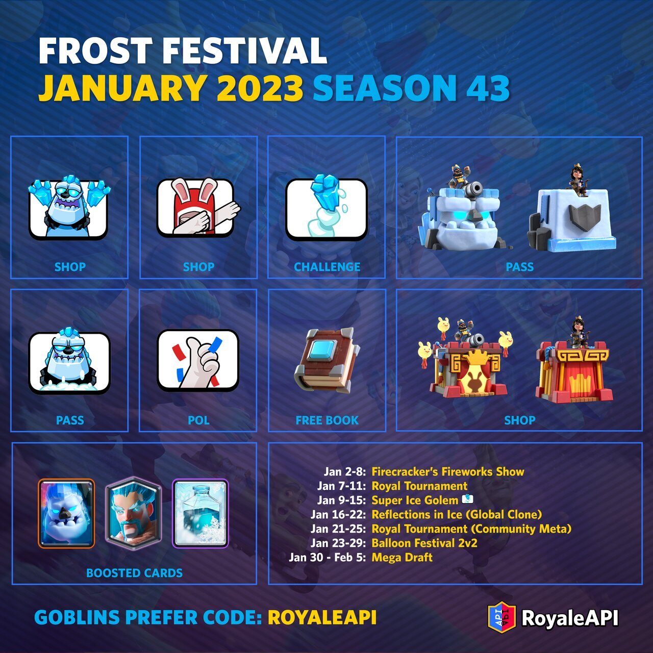 The holidays continue in the new year at the Frost Festival. Theme of this season will be the Ice Golem. He will get a new card art update, and you’ll be able to get 5 new emotes, 2 new tower skins and a whopping 38 banner items!